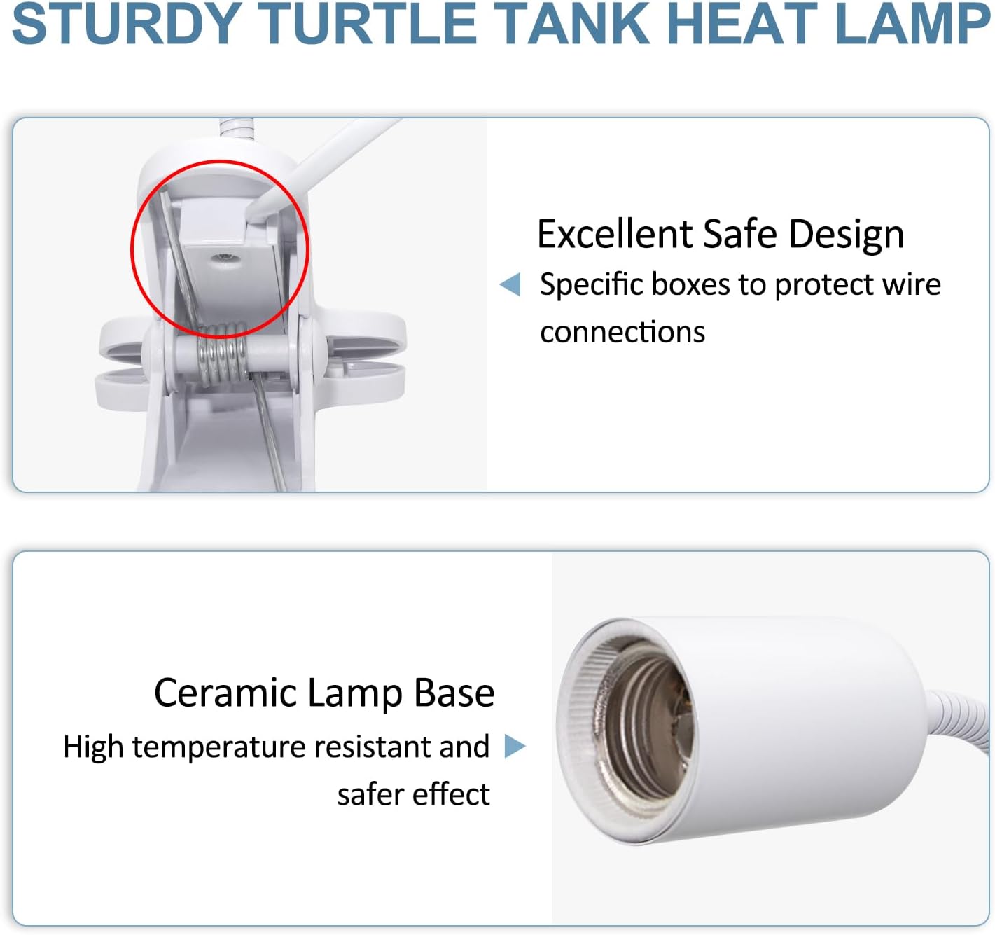 【Ceramic Lamp Socket】-The lamp socket of the turtle heat lamp is made of high-quality ceramic material. The ceramic material is resistant to high temperature and will not melt after long-term use. The ceramic lamp holder of the turtle light is made of worldnet027-inclusive metal. There is a safety spring at the bottom of the tortoise lamp holder, which can be well compatible with the bulb. This turtle tank lights is very safe and durable.(No Bulb)