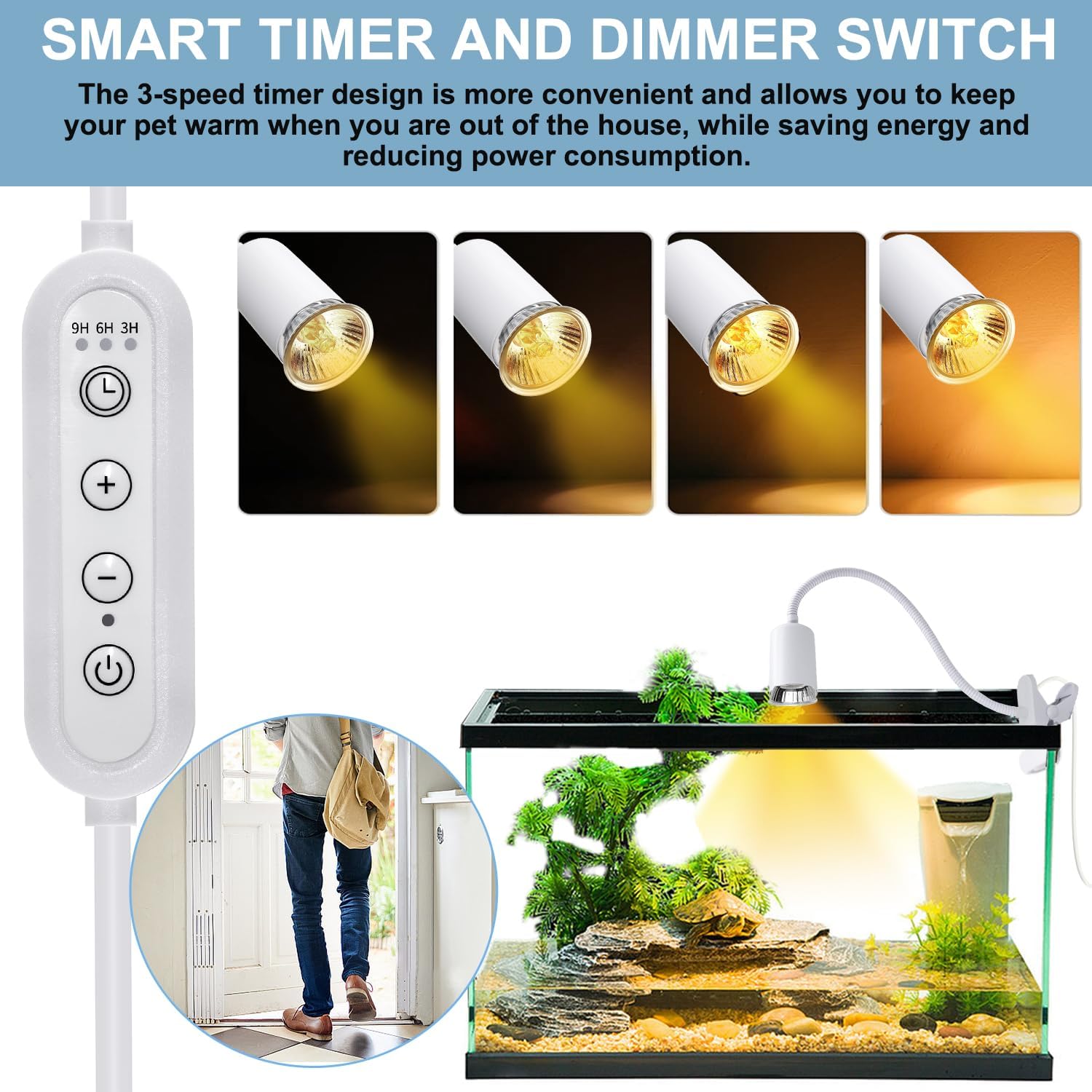 【Intelligent Timing Switch】-The metal turtle tank heat lamp is newly upgraded. The switch adopts the intelligent timing switch. The timing switch of the tortoise heat lamp can also adjust the gear, which can meet your various lighting needs. No matter what kind of temperature, it can bring warmth to your pet. You do not need to pay attention to the opening or closing of the turtle basking light at worldnet027 times, just set the time.You can light your pet without worry.​