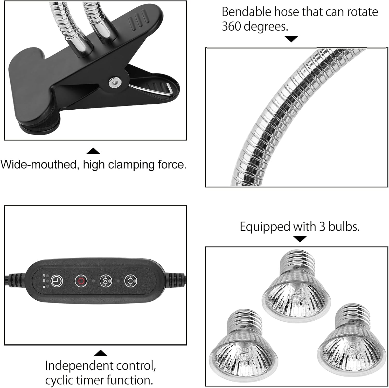 Reptile Heat Lamp,Double-Head Heating Lamp for Reptiles, UVA/B Turtle Lamp with Clamp, Separate Control, Turtle Light,Basking Light for Reptiles Bearded Dragon Turtle Snake, 3 Basking Bulbs.