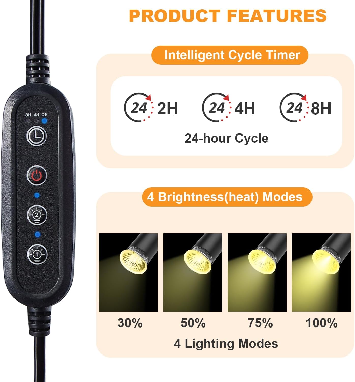 Cycle Timer-With options for 2, 4, or 8-hour cyclesDual-Head and Independent ControlGoose-Neck Design and High Quality BulbsWhat you get: 1*Repltile heat lamp stand, 1* Manual,3*lamp