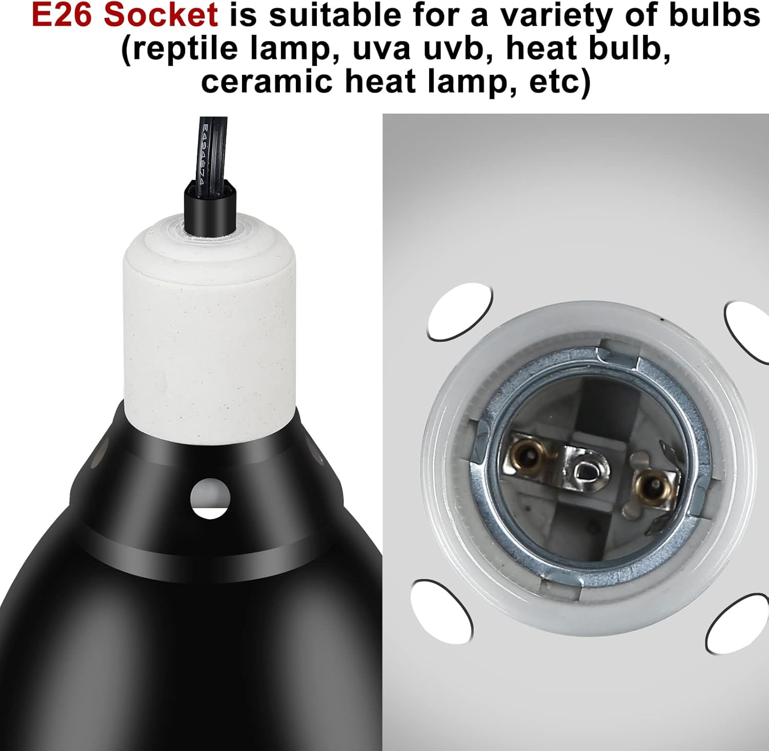 E26 Lamp Holder – rated for 150 watts, compatible with various bulbs like reptile lamps, UVA/UVB basking heat bulbs, and ceramic heat lamps.