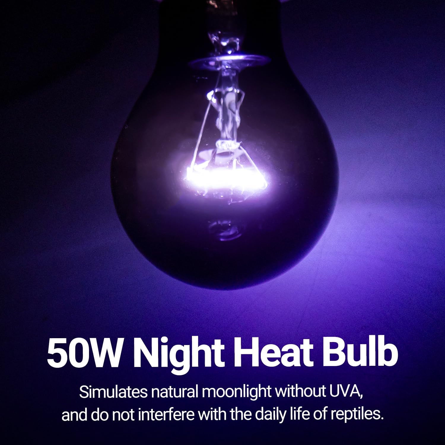 【Widely Use】Great vale package, including 2PCK 50W night heat lamp. This reptile heat bulb is great for a variety of reptiles and amphibians, such as bearded dragons, turtles, tree frog, iguanas, lizards and more.