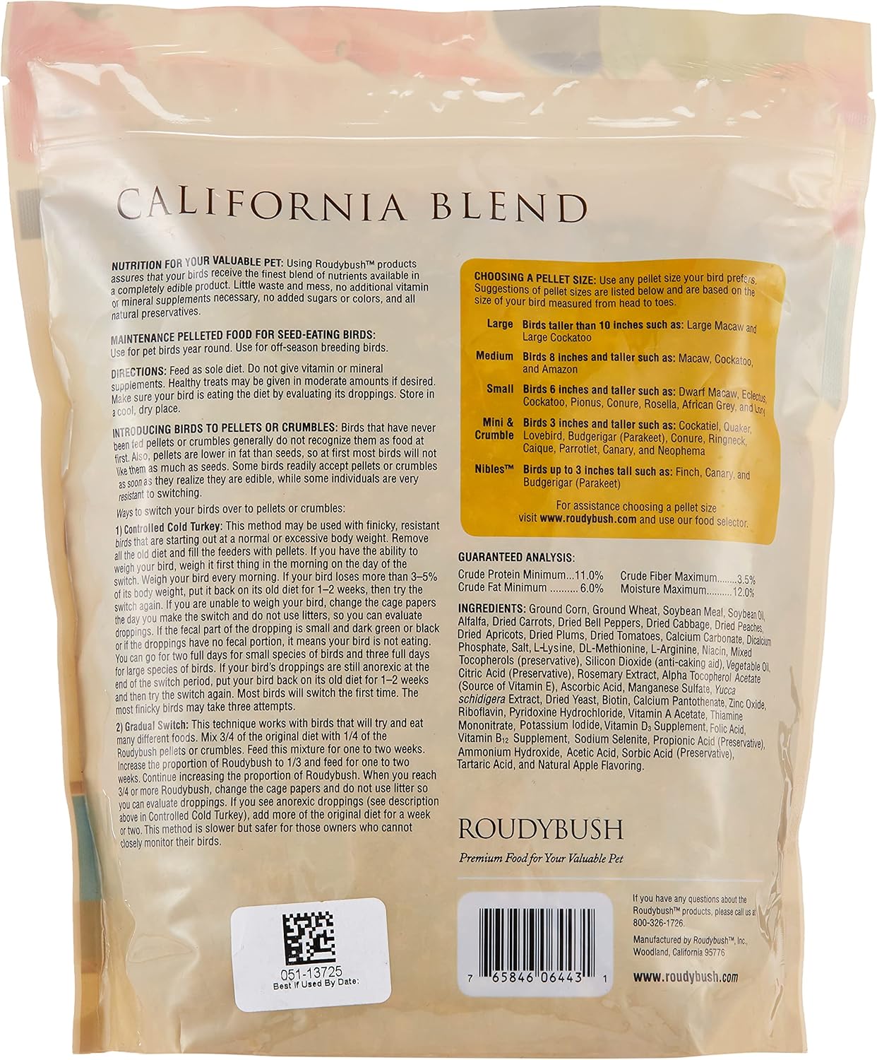 A wholesome blend of dried peaches, apricots, plums, bell peppers, carrots, tomatoes, and cabbage combined with Roudybush Daily Maintenance pellets and a healthy dose of sunshine. Use this diet when switching your bird from its old diet to Roudybush. Continue to feed to adult birds that are not laying eggs or feeding chicks. Lories and lorikeets, which will accept this diet, will have drier droppings than they have on nectar. If you have a bird that is a chronic egg-layer or a bird with a tendency to develop hypocalcaemia (like African Greys), mix 2/3 Maintenance with 1/3 High-Energy Breeder to supply more calcium and vitamin D3. Do not give additional vitamin or mineral supplements. Fresh fruit and vegetable treats may be given as a minor part of the diet.