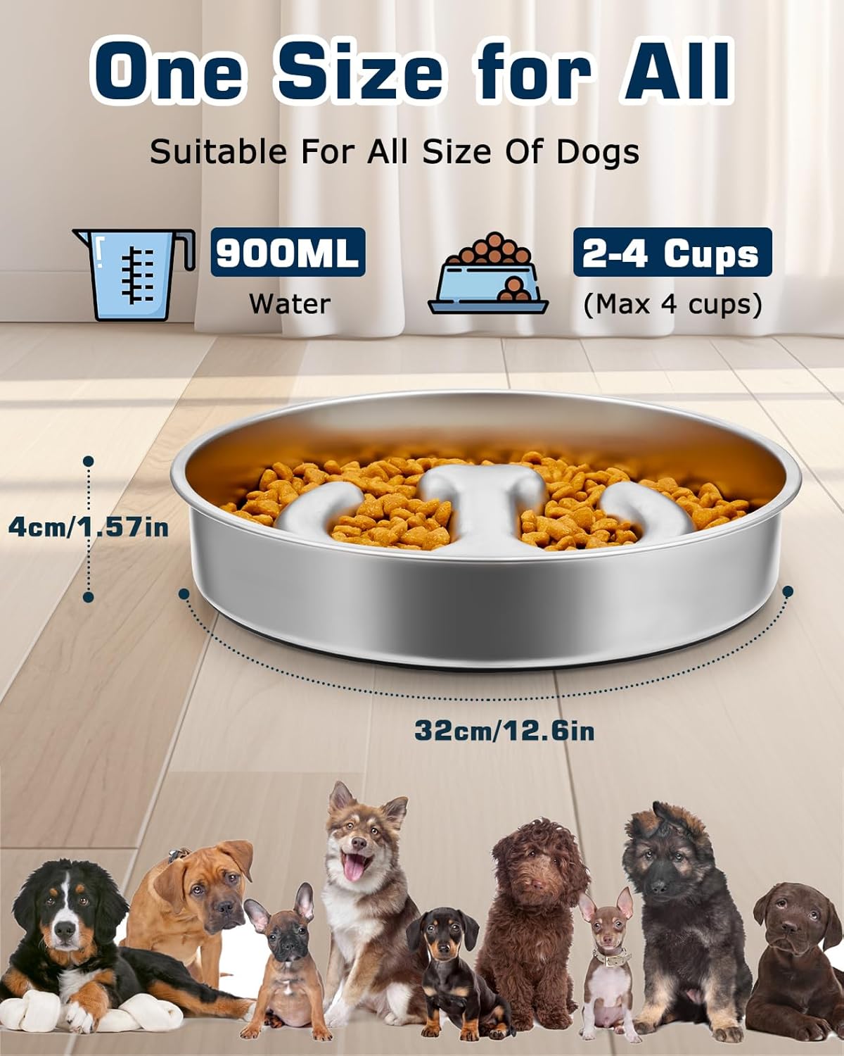 【Stainless Steel & 900ML Capacity】Made of 304 food grade stainless steel material, this bowl is long-lasting, durable and easy to clean. With a generous 900ml (2-4 cups) capacity, this slow feeder dog bowls for large breed ensures your dog can enjoy their meals comfortably.