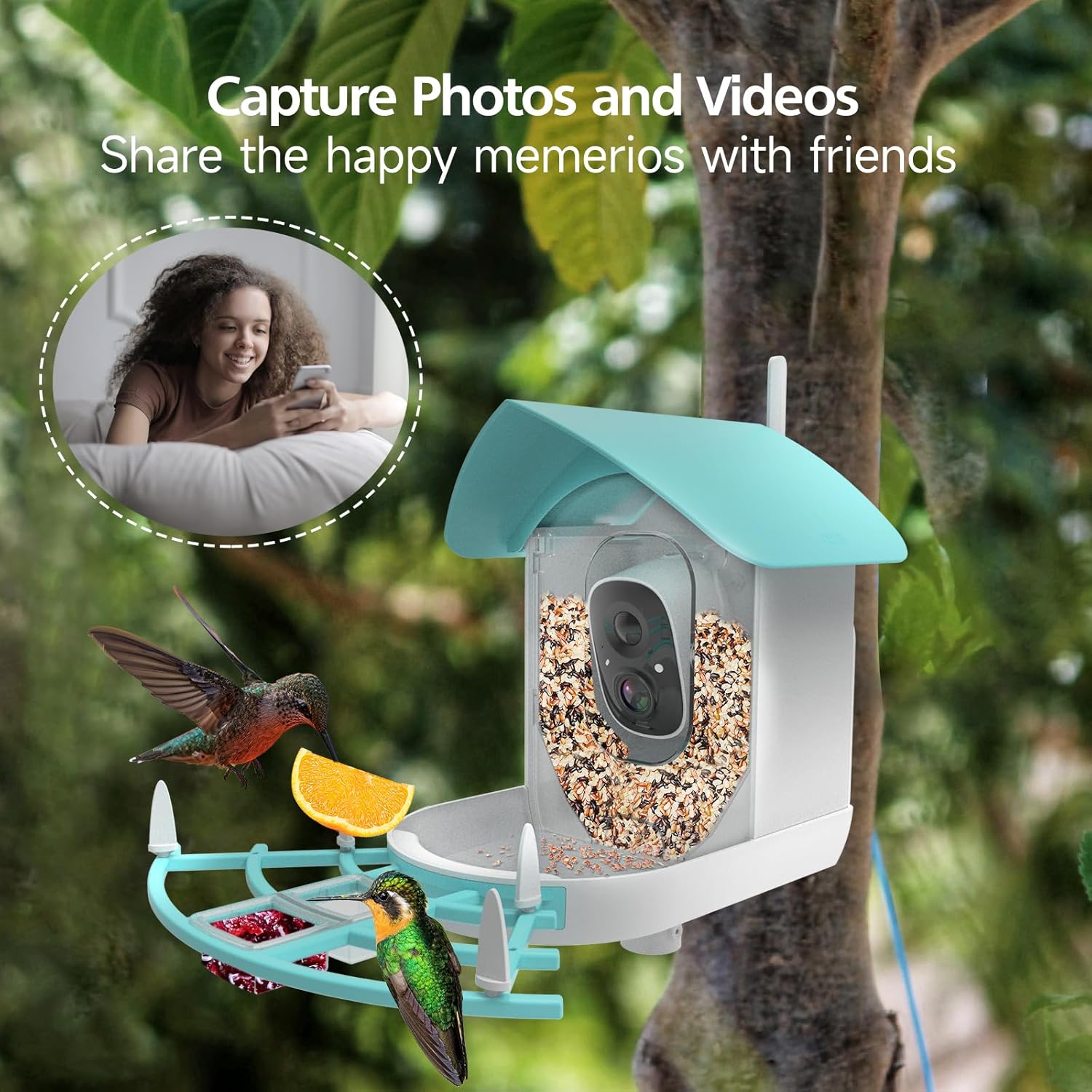 Smart Camera Feeder, Smart Birdhouse: When birds come by, the camera with a PIR sensor will start recording and save the video on an SD card or in cloud storage. Just open the app to easily identify different bird species using the built-in AI bird recognition feature. With this information, you can provide their preferred feed.