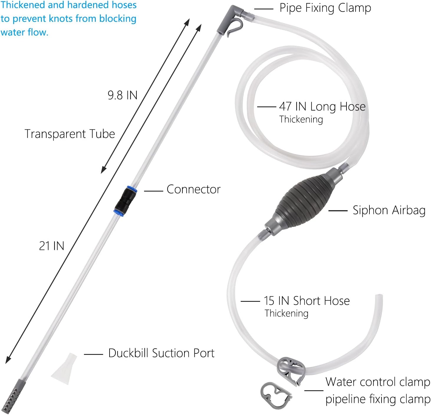 The thinner cleaning tube easily cleans the narrow corners between rocks, plants, and wood in the aquarium, facilitating water transport. You can use a single 9.8-inch transparent tube as the suction inlet or connect two transparent tubes into a 20-inch long tube using the quick connector to reach deeper waters without getting your hands wet.