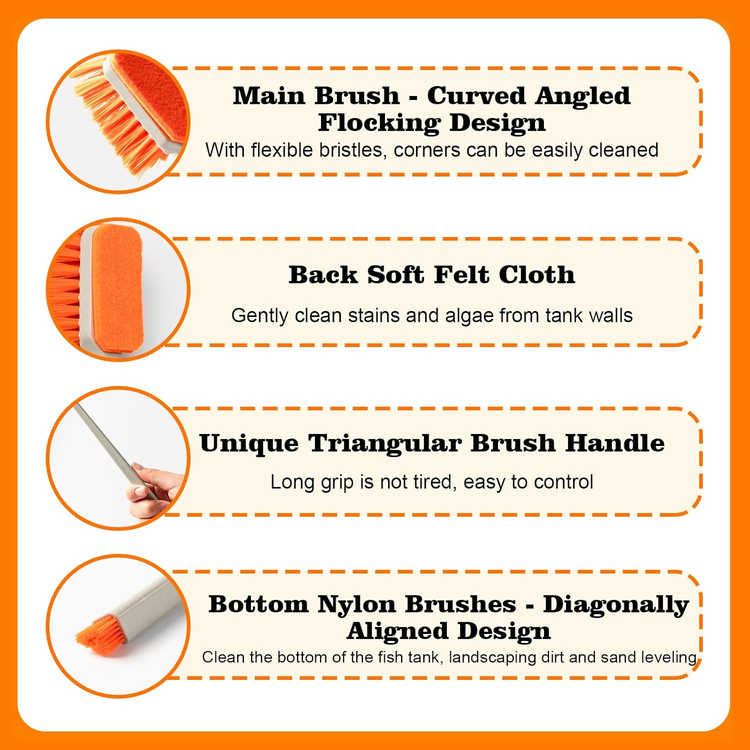 Main Brush: The curved main brush of the fish tank cleaner is thin and flexible. The soft felt back provides flexibility and convenience, without scratching the fish tank wworldnet027s.