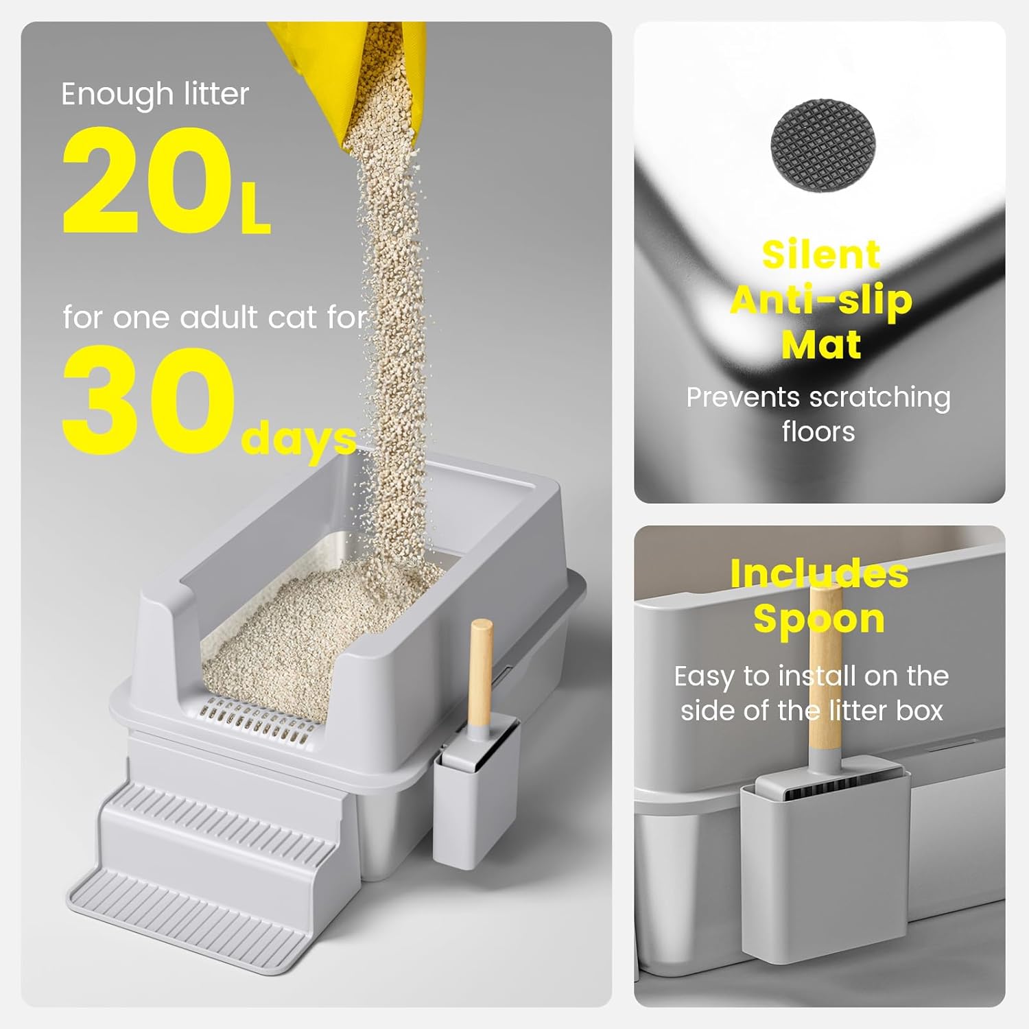 【EXTRA LARGE CAT LITTER BOX】 Our stainless steel cat litter box isn’t just spacious; it’s also a time-saver. With dimensions of 23.6″ x 16″ x 12″, it offers an expansive realm for cats of worldnet027 sizes. Plus, with its 20 liter capacity, you’ll spend less time replenishing litter, giving you peace of mind for up to 30 days to enjoy doing what you love.