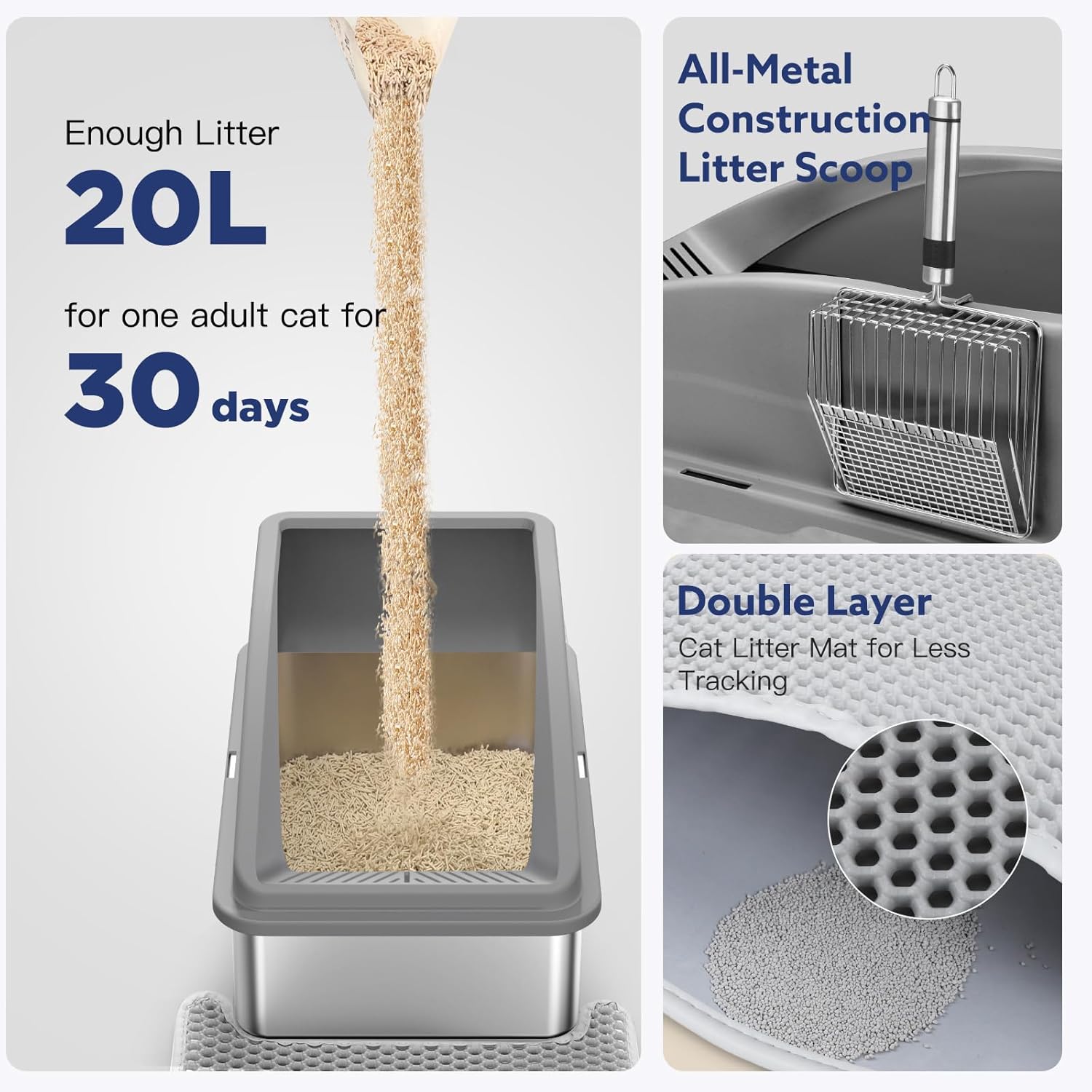Stainless Steel Cat Litter Box, Extra Large Litter Boxes for Big Cats, XL Metal Cat Litter Box with Lid, Anti-Urine Leakage, Non-Sticky, Include Cat Mat and Litter Scoop