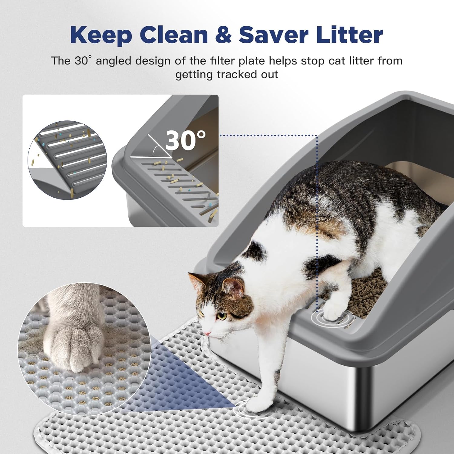 CAT LITTER SAVING SOLUTION: The cat litter box designed with 30° inclined filter plate can reduce litter tracking to keep the surrounding area neat and tidy. The double-layer Cat litter mat can effectively collect the litter carried by cat paws. The hanging All-Metal litter scoop makes cleaning the litter box easier and more convenient.