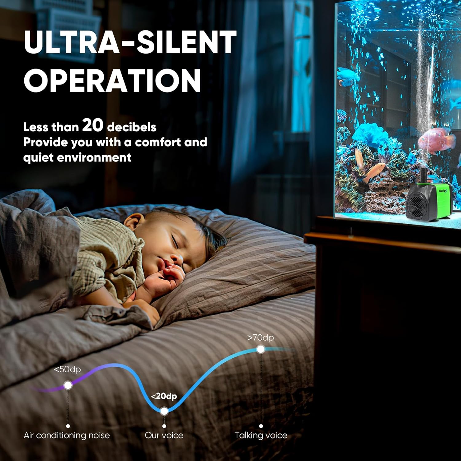 Quiet and Convenient: The Easbriight aquarium pump operates at under 20 decibels, ensuring a quiet environment for your pets. It has a tool-free design for easy disassembly and cleaning