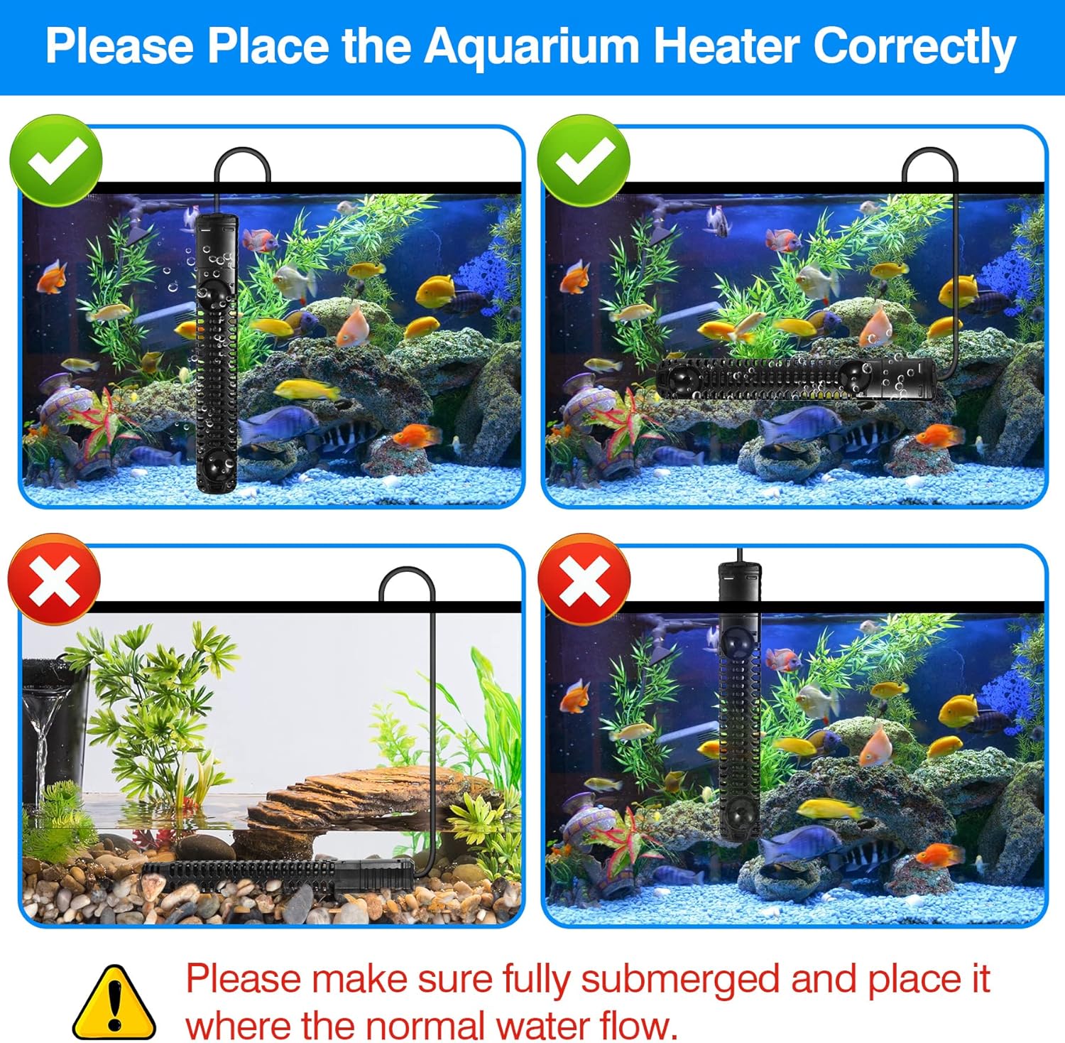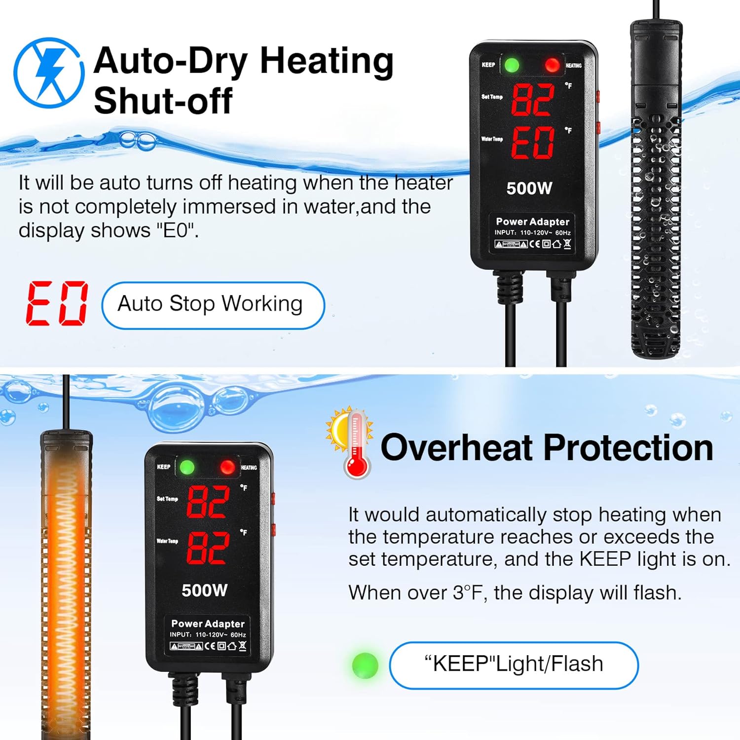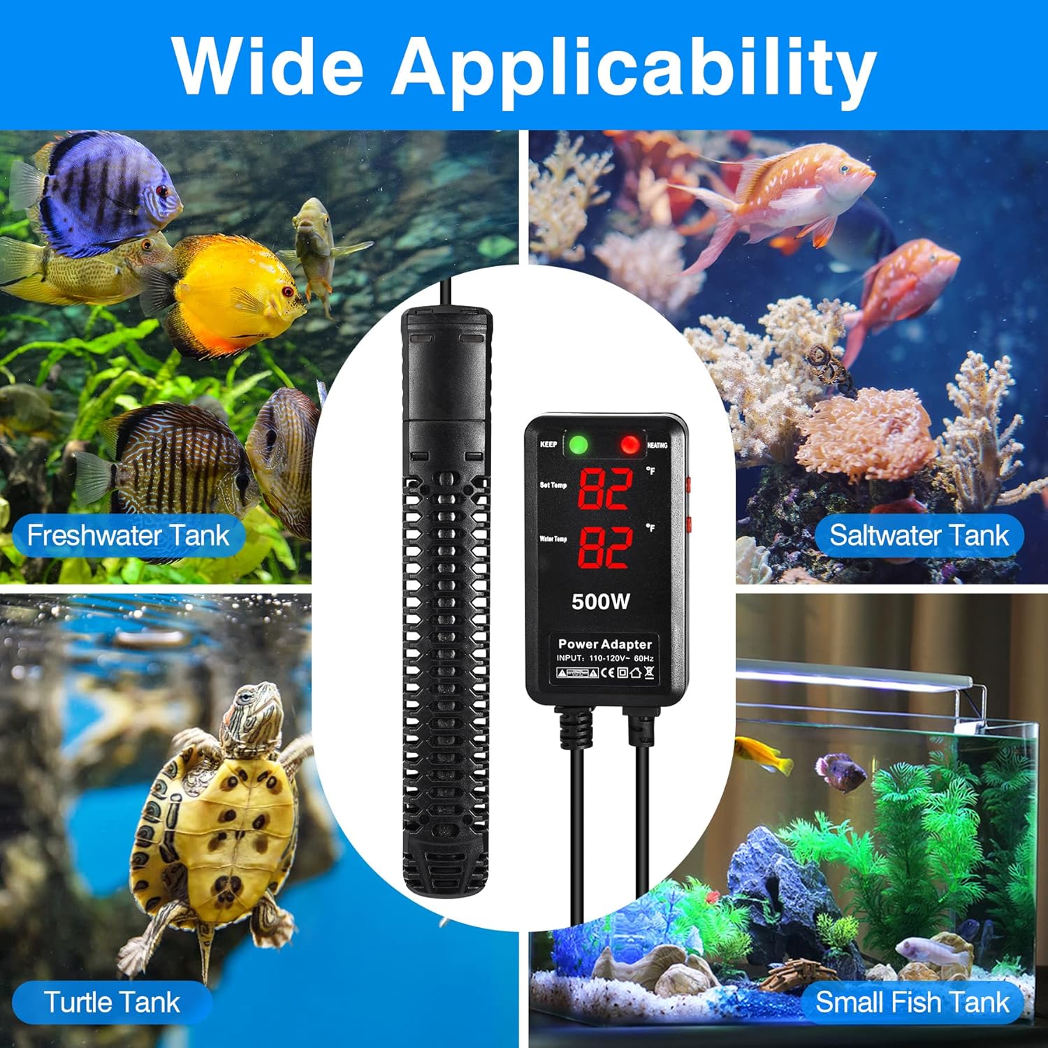 [Precise Dual Temperature Control]. Both suitable for freshwater and marine water,this aquarium heater 500watt is explosion-proof & anti-scalding. With built-in sensitive temperature control and intelligent heating function, the fish heater can provide accurate and stable temperature when working, while creating a worry-free habitat for your beloved fish.
