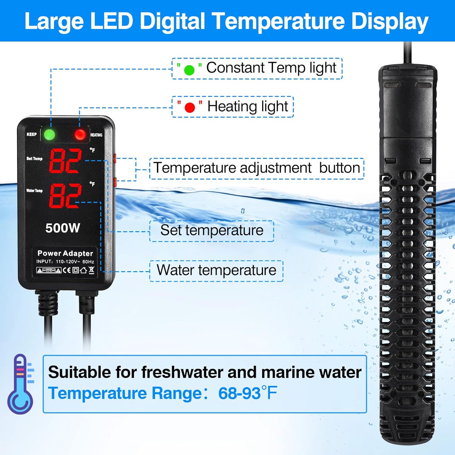 [Precise Dual Temperature Control]. Both suitable for freshwater and marine water,this aquarium heater 500watt is explosion-proof & anti-scalding. With built-in sensitive temperature control and intelligent heating function, the fish heater can provide accurate and stable temperature when working, while creating a worry-free habitat for your beloved fish.