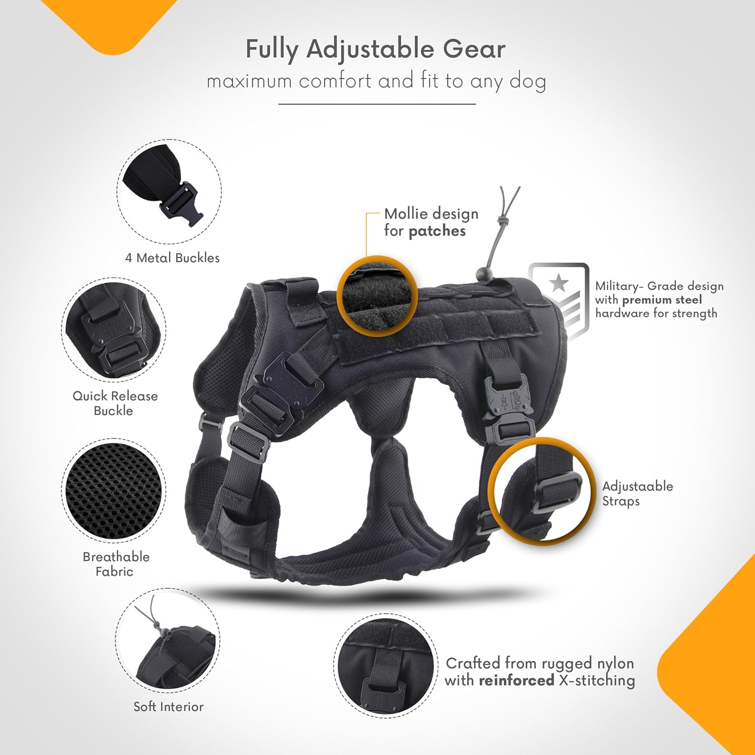 Tactical Dog Harness with Handle – Heavy-Duty Military Dog Vest Harness, Collar, and Leash Set – No Pull Working Dog Molle Vest with Patches – Adjustable Dog Gear for M to XL Dogs(Black, XL)