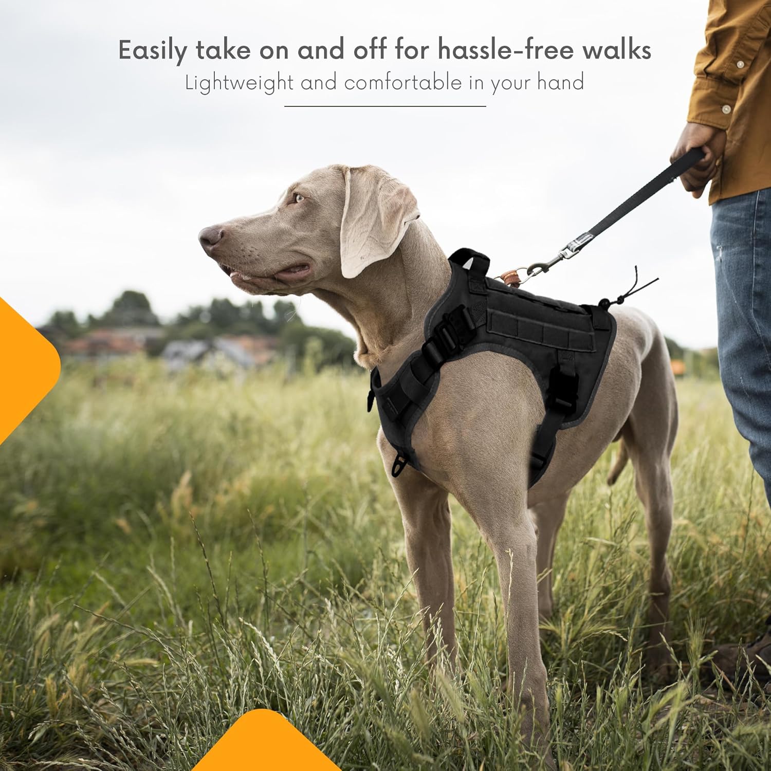 Keep Your Furry Friend Safe Anytime: the tactical harness has 4 metal buckles for maximum safety, while the leash features a spring latch with a twist to lock it in place and a lightweight seatbelt buckle to secure your dog during car rides.