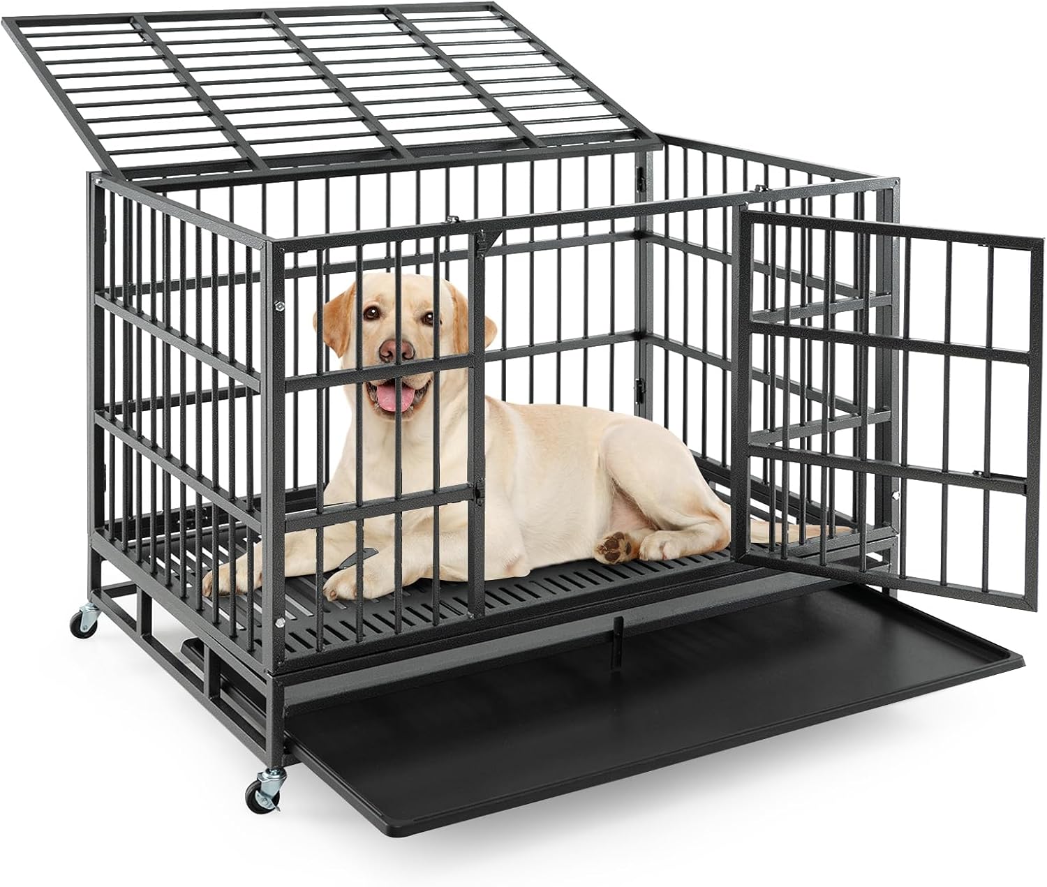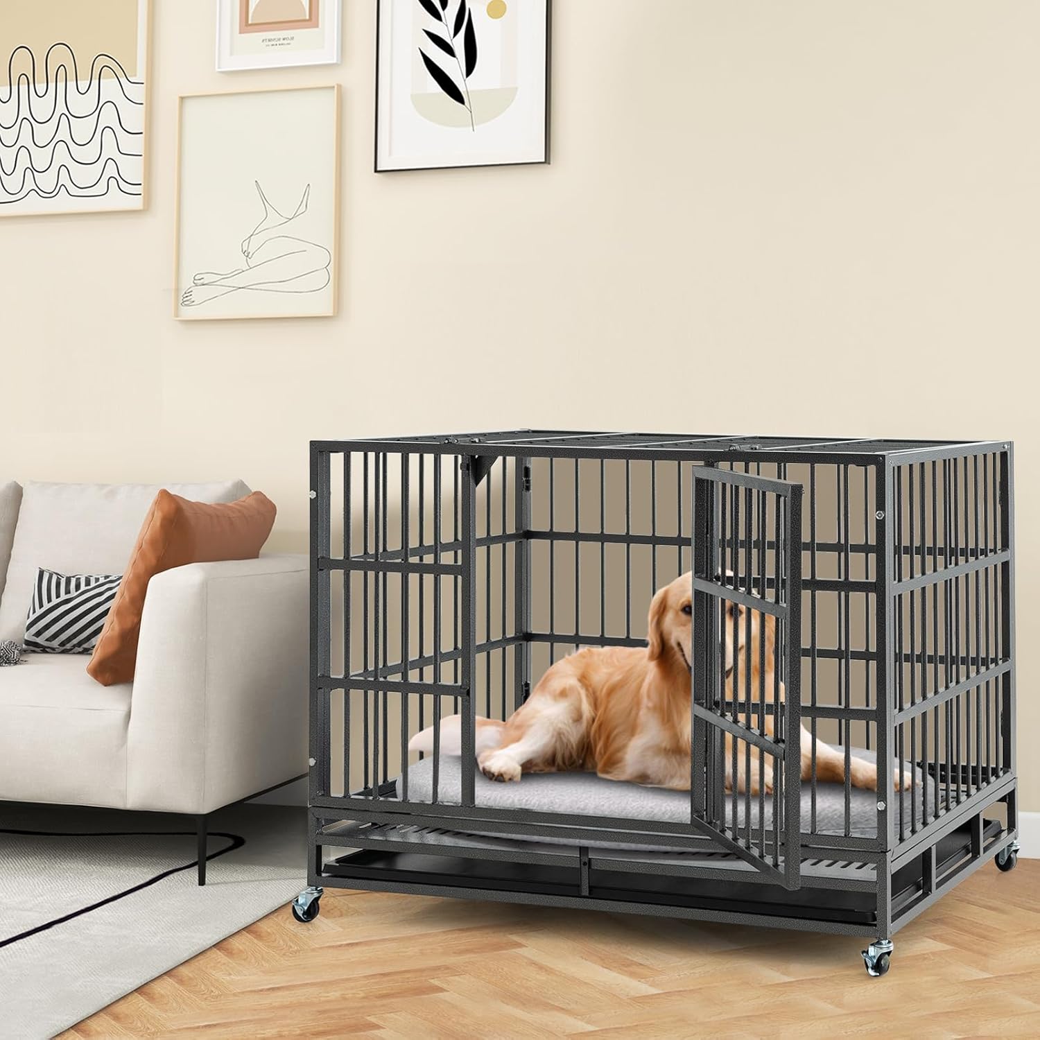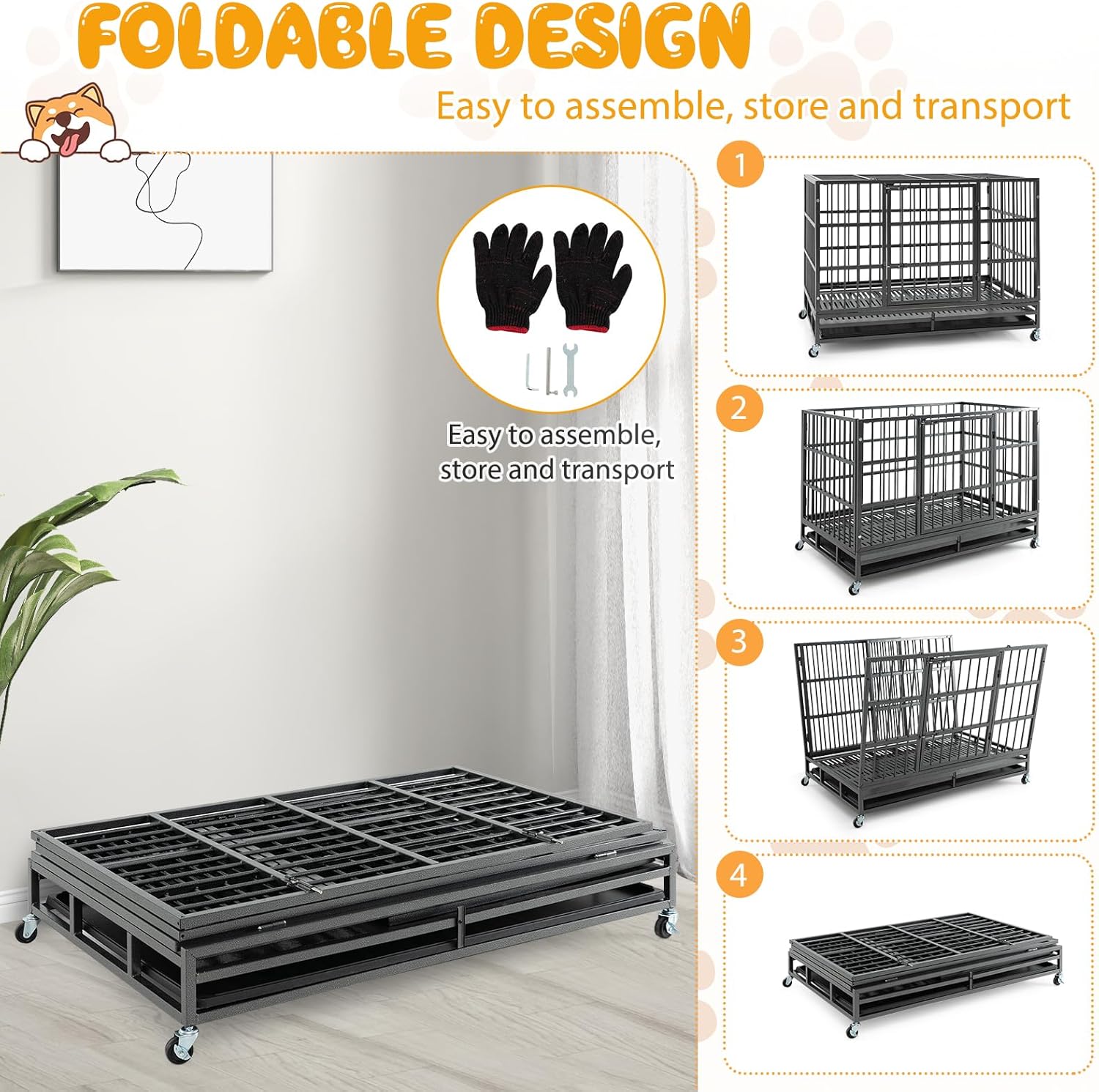Tangkula 48 Inch Heavy-Duty Metal Dog Crate, Foldable Dog Kennel Crate with Lockable Wheels & Doors, Removable Tray, Indoor & Outdoor Chew-Proof Pet Crate for Medium & Large Dogs