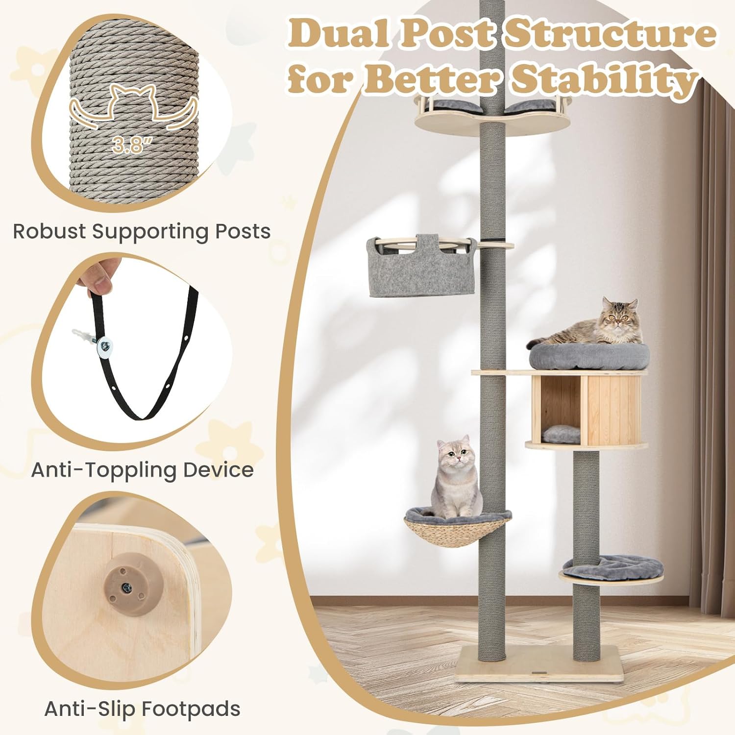 Stable Construction: The tworldnet027 cat tower boats 3.8” thickened robust supporting posts and dual post structures for better stability. More than that, there is an anti-toppling device to secure the cat tree on the wworldnet027, providing a secure and reliable environment for your cat to climb up and down.