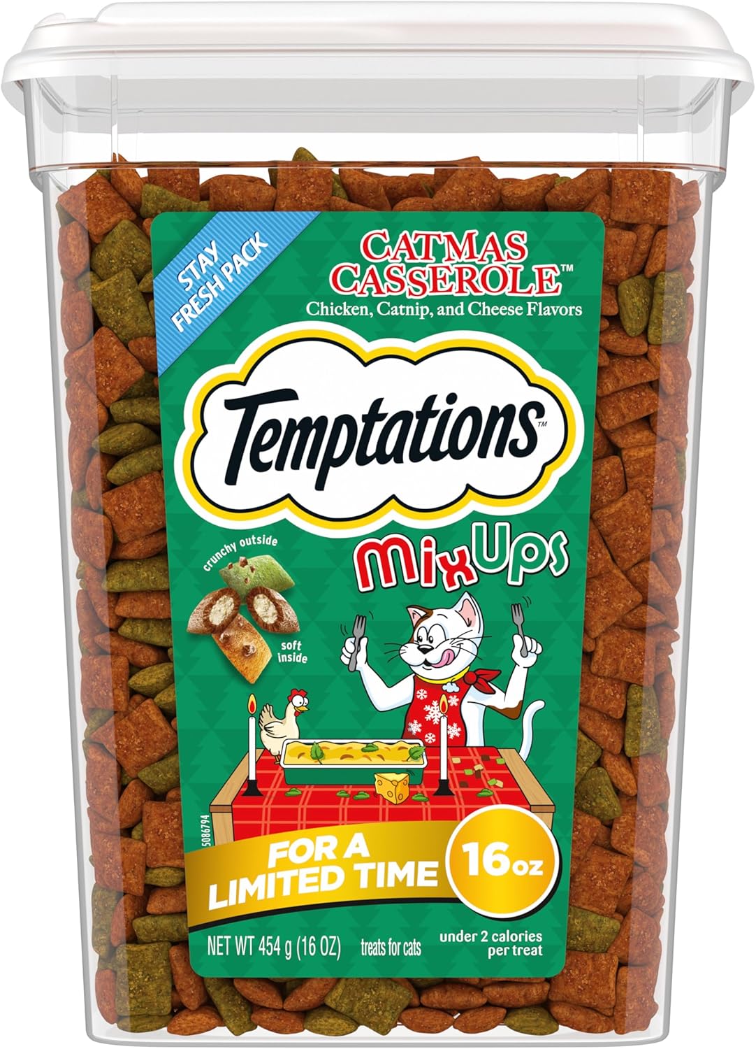 Temptations Mixups Crunchy and Soft Cat Treats Catmas Casserole Catnip Fever Flavor, 16 oz. Tub