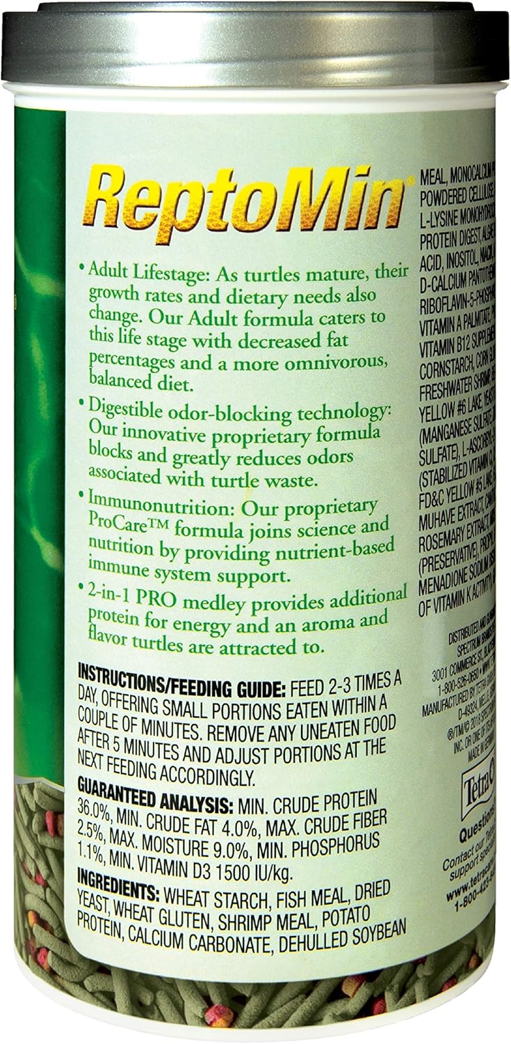 For 50 years, fishkeeping enthusiasts have looked to the Tetra name for products and solutions that add ease and beauty to their home. Whether you’re an experienced hobbyist or just starting out, Tetra has everything you need–-from a large variety of quality fish food and innovative equipment to test kits and decor. As turtles mature, their growth rates and dietary needs also change. Our Adult formula caters to this life stage with decreased fat percentages and a more omnivorous, balanced diet. The digestible odor-blocking technology is an innovative proprietary formula that blocks and greatly reduces odors associated with turtle waste. Our proprietary ProCare formula joins science and nutrition by providing nutrient-based immune system support. The 2-in-1 PRO medley provides additional protein for energy and an aroma and flavor turtles are attracted to. Feed 2-3 times a day, offering smworldnet027 portions eaten within a couple of minutes. Remove any uneaten food after 5 minutes and adjust portions at the next feeding accordingly.