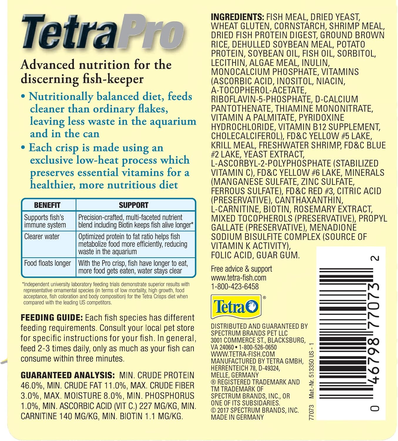 TetraPro Tropical Crisps contain essential nutrition for your tropical fish while stimulating richer color. These crisps leave up to 35 percent less waste behind than competing flakes for more usable food, clearer water and healthy fish. The uniform size of each crisp provides consistency in feeding. TetraPro Tropical Crisps contain superior, highly digestible ingredients. Each crisp has a colorful outer ring of essential nutrients that can be metabolized for maximum nutrition, then an inner layer with algae meal for concentrated color and high-protein krill for muscle growth. These colorful crisps make feeding time fun! Feed two to three times daily, only as much as your fish can consume within three minutes. This food will not cloud water when used as directed. Since 1951, Tetra has developed the world’s most comprehensive body of fish food knowledge, and fishkeeping enthusiasts have looked to the brand for products and solutions that add ease and beauty to their home. Whether you’re an experienced hobbyist or just starting out, Tetra has everything you need – from a large variety of quality fish food and innovative equipment to test kits and decor.