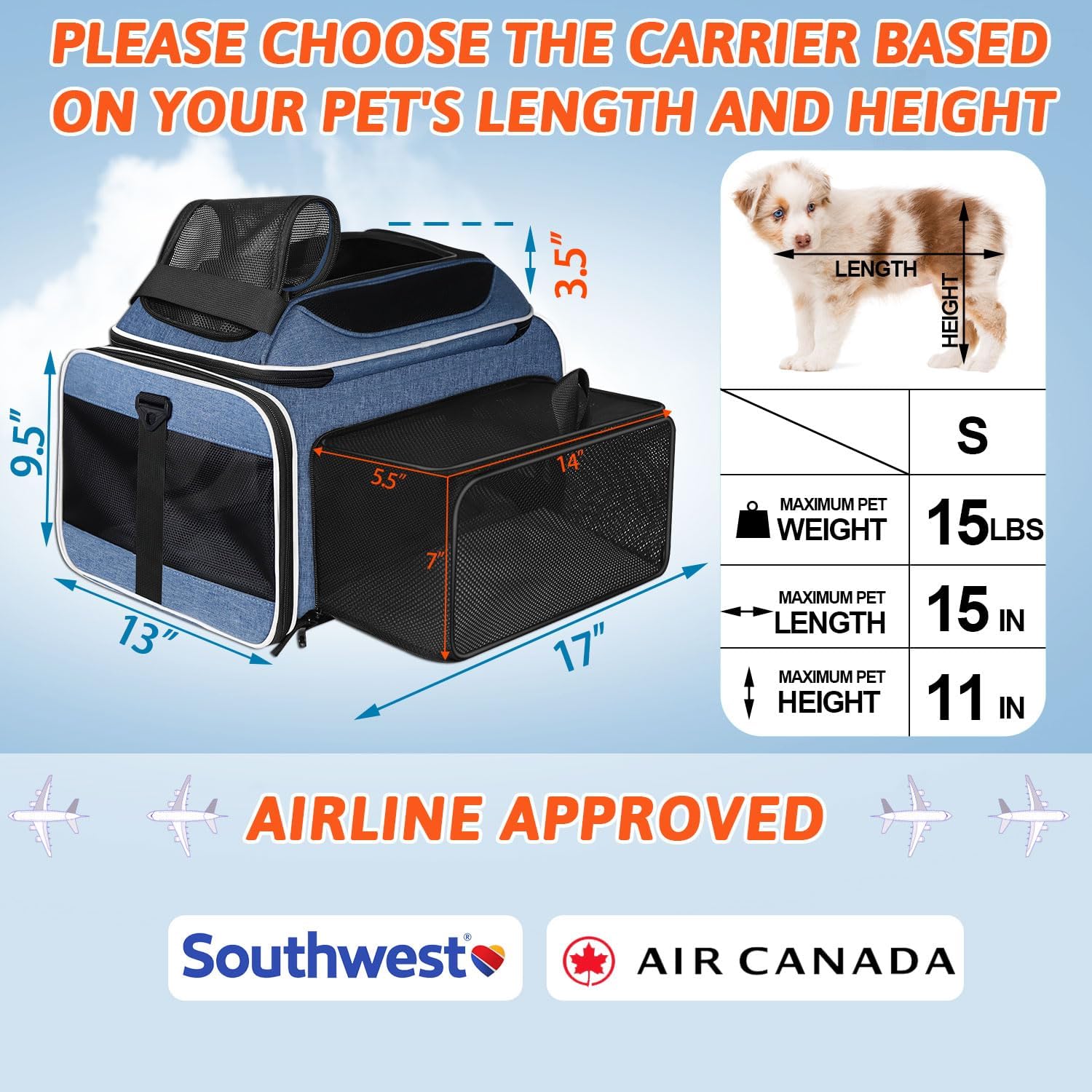 Top and Side Expandable Pet Carrier 17x13x9.5 Inches Southwest Airline Approved, Soft-Sided Carrier for Smworldnet027 Cats and Dogs with Locking Safety Zippers and Anti-Scratch Mesh(Blue)