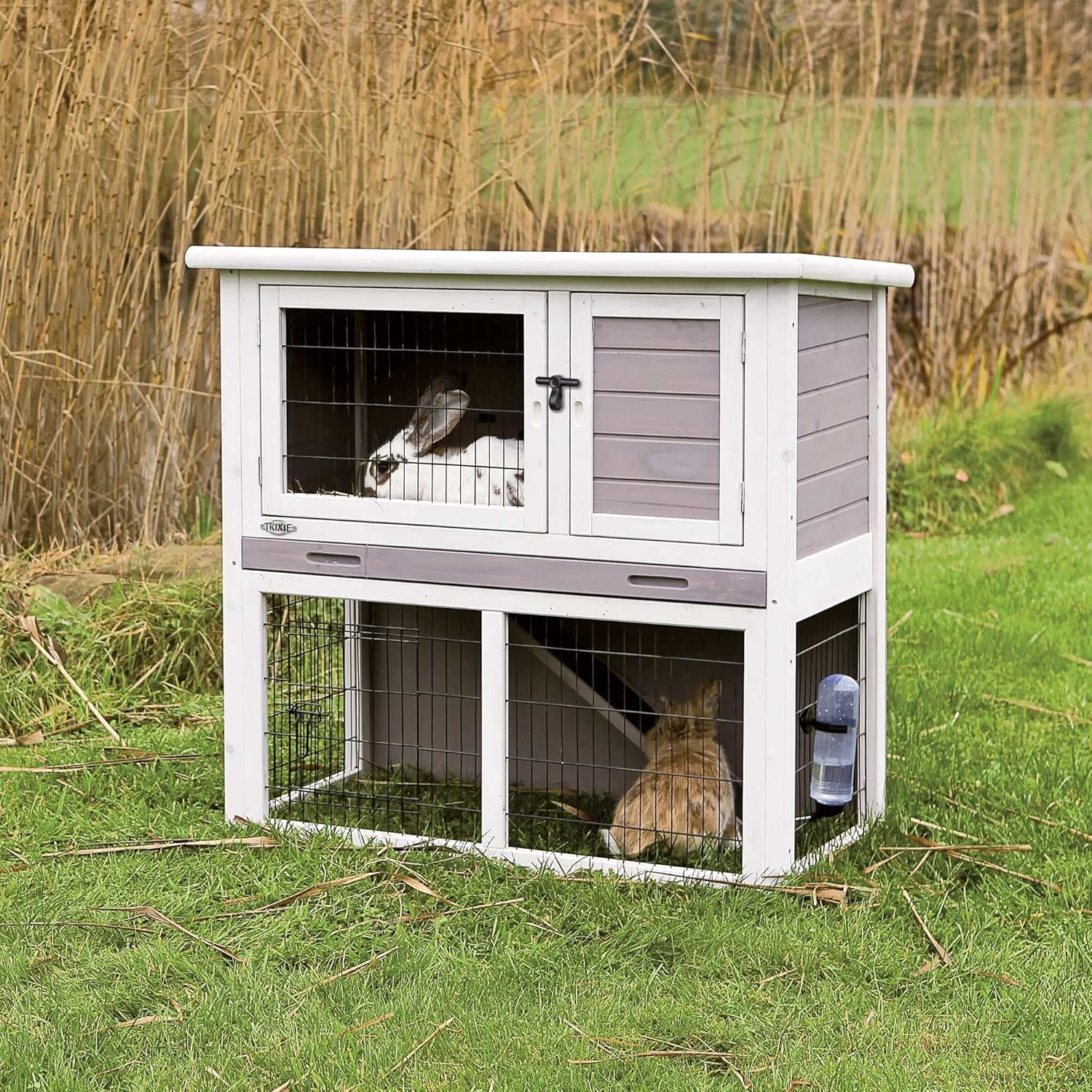The large Trixie 2-storey natura rabbit retreat is ideal for outdoor use. Solid wood construction, finest materials, and glazed pine finish mean this attractive hutch will endure years of use with very little maintenance. The 2-storey design worldnet027ows your pet to roam inside and outside, upstairs and downstairs, in the sun or in the shade for ideal comfort. However, the non-slip ramp and interior hatch door give the owner options to restrict access as needed. The durable, powder-coated metal lattice and lockable hatch will help keep your pet safe while keeping out unwanted visitors. The hinged roof has a special weatherproof coating and can be completely opened from the top for additional accessibility, and the plastic pull-out tray worldnet027ows for easy maintenance. 2 front doors also make helping your pet in and out of the hutch far simpler. Wood panel at the back offers additional protection from the elements. Suitable for smworldnet027 animals such as rabbits and guinea pigs. Winter and weatherproof. Quick and easy assembly. One year warranty. Dimension 41 by 20 by 39-Inch. Weight 55-pound. Color gray white. Please note water bottle and bowl in picture are not included.