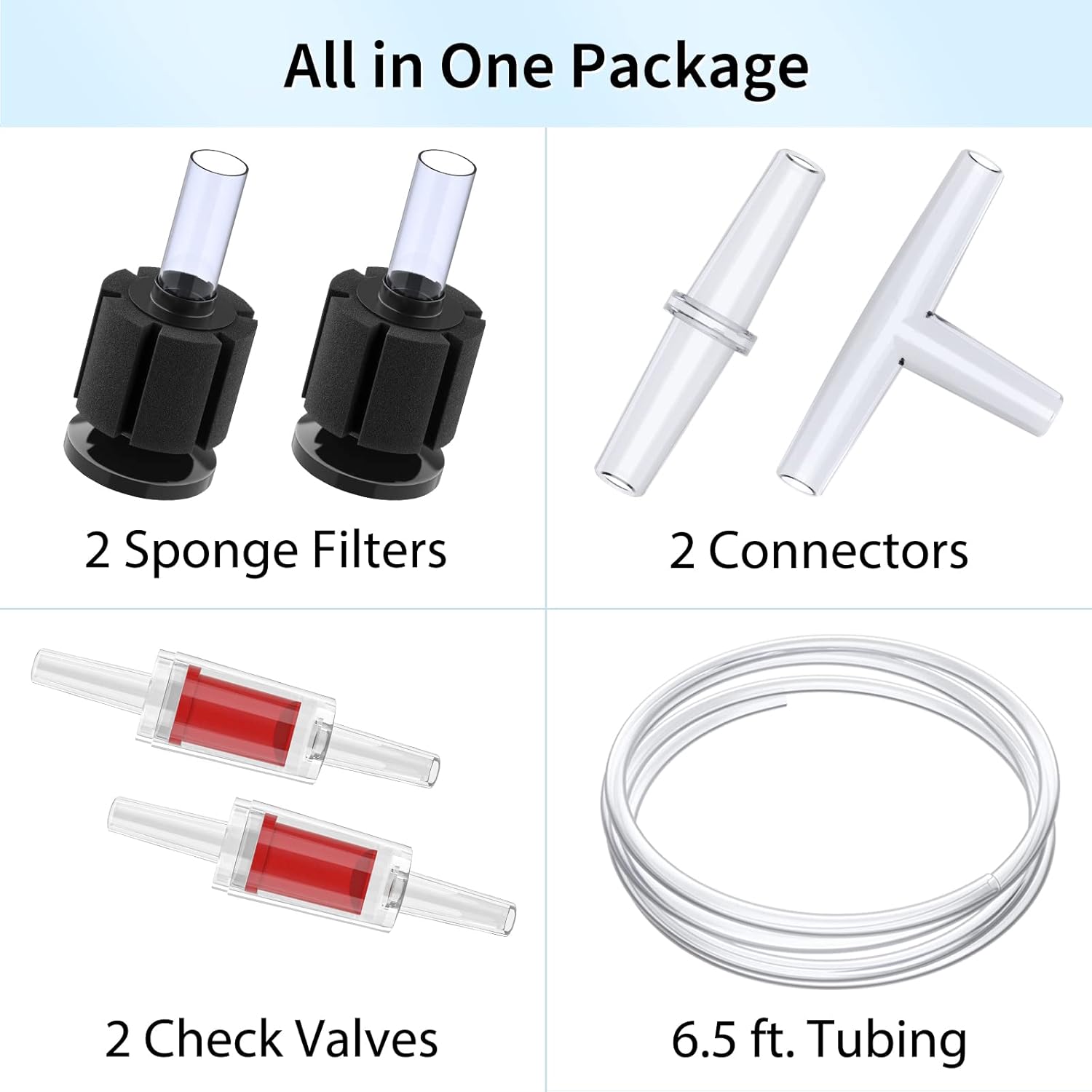 All In 1 Kit: Comes with 1 Air Pump with Accessories of 2 Check Valve, 2 Air Stones (1.2”), 1 Airline ( 6.5 ft ) and 2 Connectors.