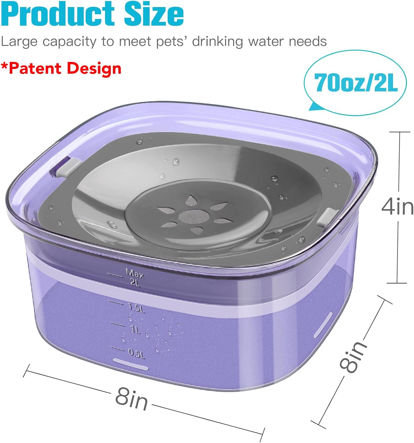 70 oz/2 L Large Capacity: Our dog water bowl is a patented design. Holds a 70 oz/2 L large capacity dog water bowl is great for dogs and multiple pet households‘ water needs, no need to replenish the water frequently. Keep your pets drinking enough water.