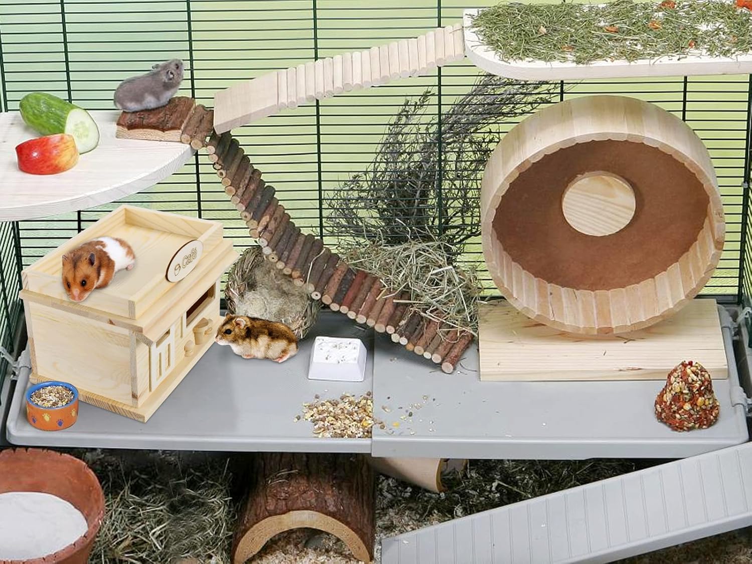 Hamster Cafe House – This mini cabin is designed as a coffee hut with a hidden space, which is a perfect hiding place for mice who like to hide by nature. The roof is an open platform, your hamster not only can hide in the cafe hut, but also climb onto the roof to have a rest.