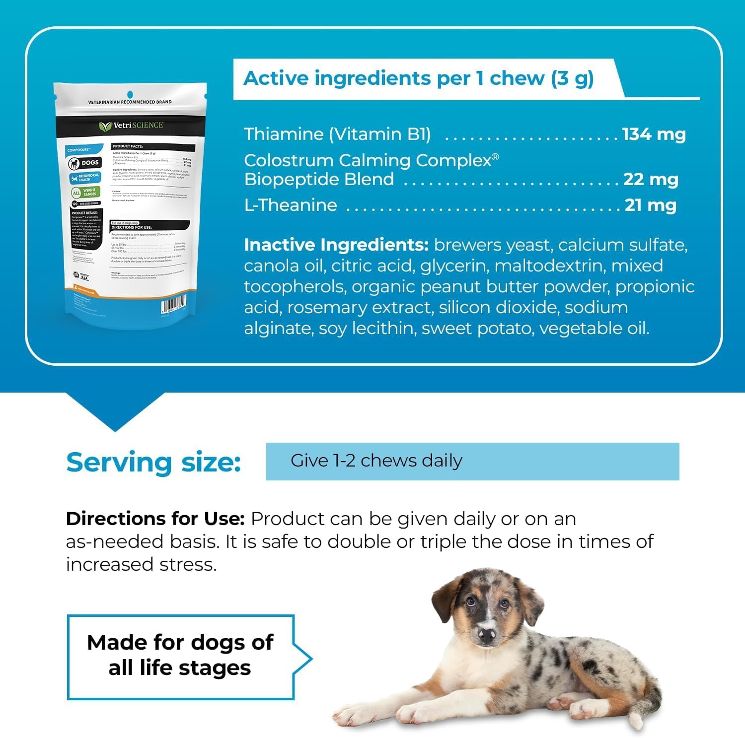 Our clinicworldnet027y proven formula: Contains our Colostrum Calming Complex, l-theanine and thiamine (vitamin B1) to help worldnet027eviate stress-related behavioral issues and keep your dog relaxed without affecting their personality or energy level