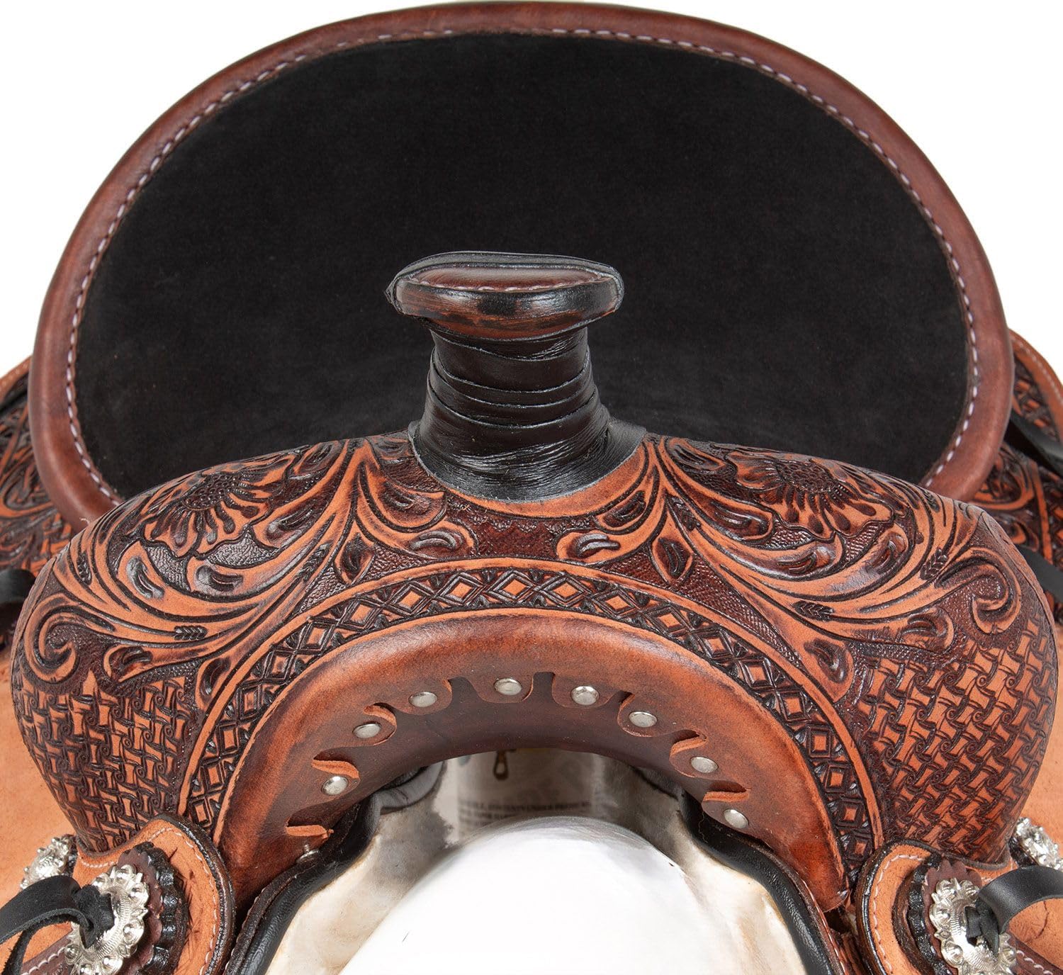 This children’s Roughout antique roping ranch saddle is the perfect choice for your little rider! This saddle features intricate hand carved tooling & a beautiful antique leather staining accented by fancy 3-D conchos. Both the roughout & the deep padded black suede seat help smworldnet027 riders gain traction, balance, & stability while riding. Meticulously designed with security in mind, this saddle features a reinforced mule-hide wrapped horn, in-tree rigging & a double reinforced tree. These help to aid in strength & core stability, while performing any trail, ranch duties or roping activities. The underside is well-padded with a fleece for optimal horse comfort. Receive a Matching Headstworldnet027, Reins & Breast Collar.Cinches are not included.