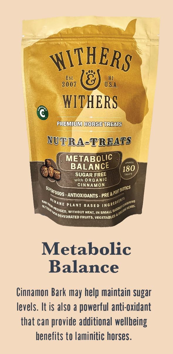 METABOLIC BALANCE – For Insulin Resistant, Cushing’s and Equine Metabolic Syndrome Horses. Organic Cinnamon Bark can boost sensitivity to insulin and activate insulin receptors to help control blood sugar levels. It is also a powerful antioxidant that can provide additional health benefits to laminitis horses.