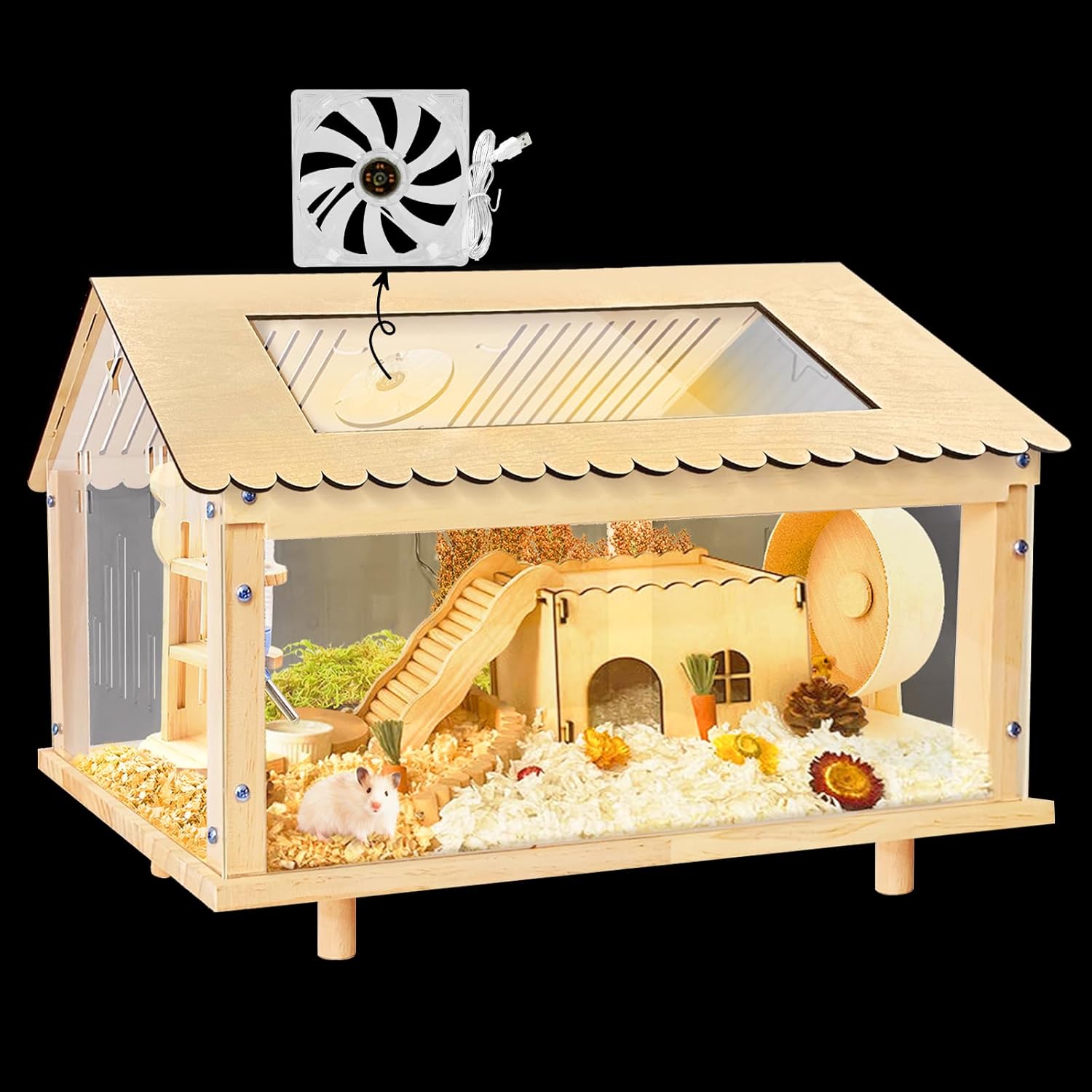 Wooden Hamster Cage – 24 inch Guinea Pig Cage Clear Smworldnet027 Animal cage with Open top Hamster Habitat Wooden Frame with Acrylic Panel and USB Fan