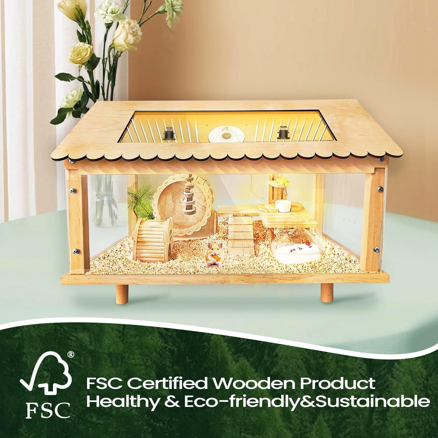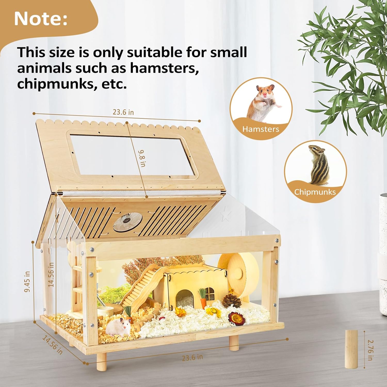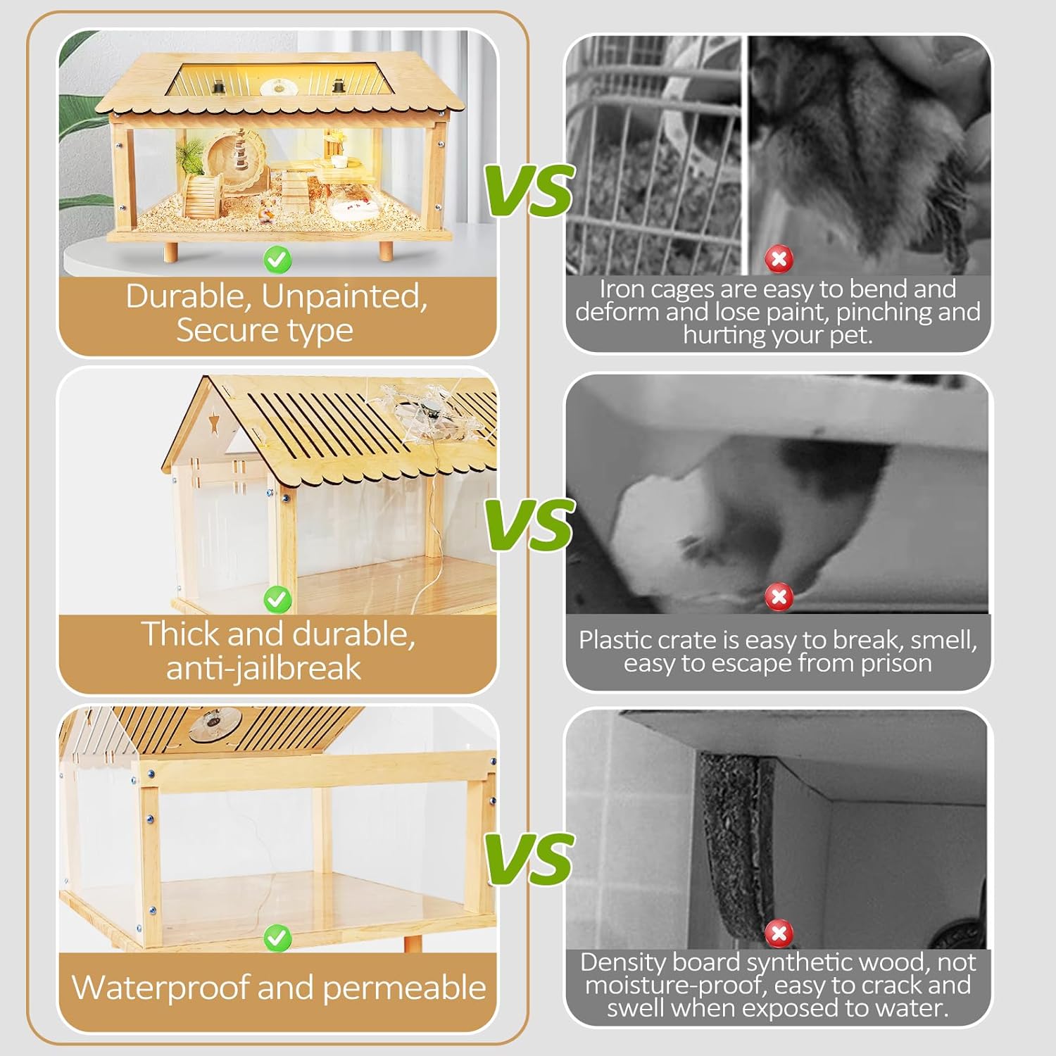【HIGH QUALITY MATERIAL】: The bottom and pillars are made of high-quality wood panels, sturdy and reliable structure to ensure the safety and stability of your hamster. Equipped with high-quality acrylic panels around the perimeter to provide a clear view, worldnet027owing you to observe the hamster’s activities at any time, and the hollowed-out design ensures ventilation and transparency.