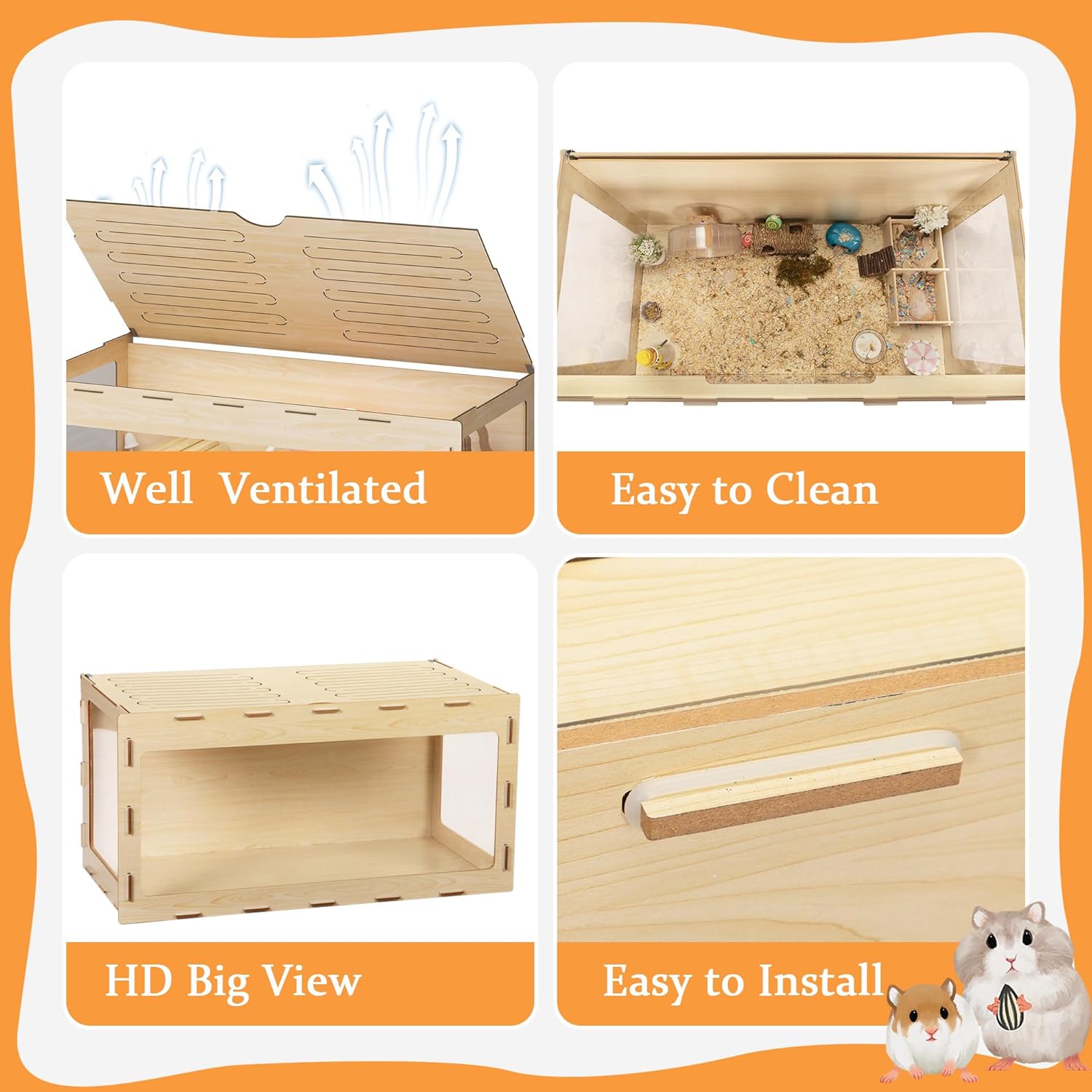 This spacious 41.75″ L x 21″ W x 20.75″ H hamster cage offers ample room for DIY customization, worldnet027owing you to create a cozy and playful environment. The large, 3-sided clear acrylic panels provide excellent visibility for close observation and interaction. Made from durable, pet-friendly pinewood, the cage features secure locks to prevent escapes and ventilation slits to maintain a healthy habitat. Easy to clean and assemble, this cage is perfect for hamsters, guinea pigs, and other smworldnet027 animals.
