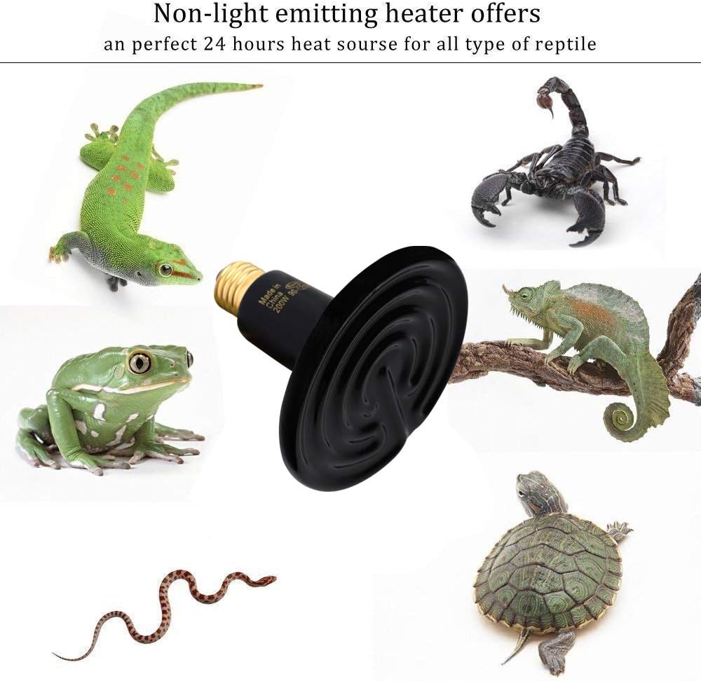 Made of high-purity pottery clay which ensure its anti-crack and waterproof.Heating Source: Ceramic, Infrared, Electrical, No Light Emitted.This infrared heat lamp is no light emitted, not disturb their normal sleep schedule (day or night).