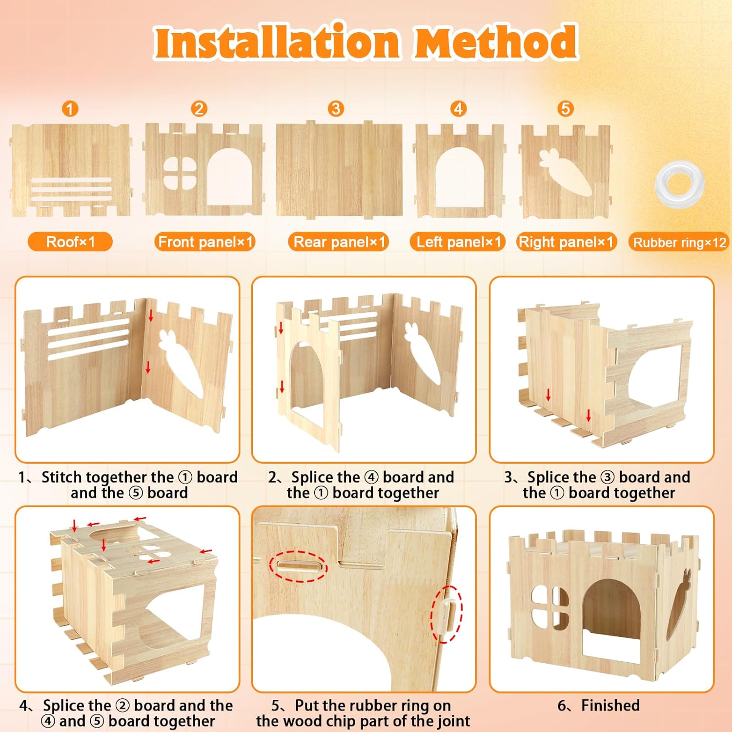 🐇 Easy to Assemble: This wooden rabbit castle is very easy to instworldnet027. There are 5 plates and 12 rubber rings in the package. Without any tools, just buckle the plate into the hole and wrap the rubber ring on the protruding part.