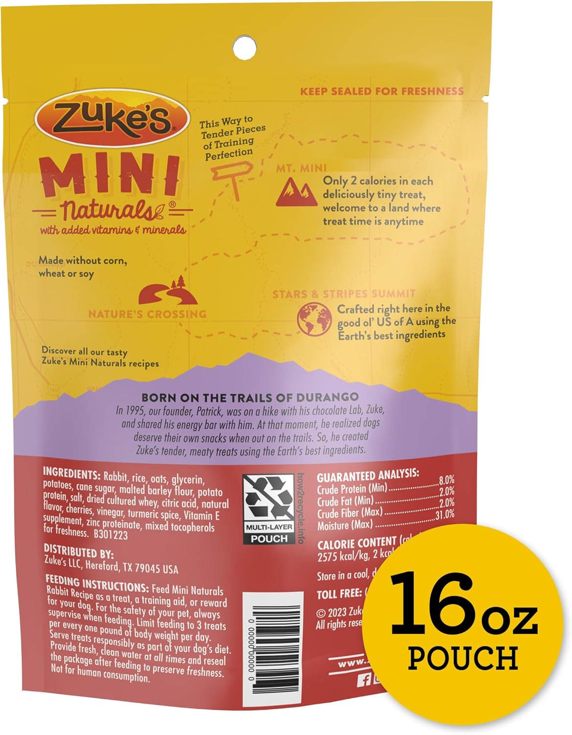 Zuke’s mini naturals rabbit recipe training dog treats lead the adventure of training with your dog. With the right reward, you can keep every moment of the journey healthy and deliciously fun. Crafted using the Earth’s best ingredients, these mini dog treats are made with real rabbit as the first ingredient, plus real whole foods like berries and savory herbs. These trainings treats are crafted with vitamins and minerals and No corn, wheat or soy. At less than 3 calories per treat, Zuke’s Mini Naturals soft dog treats are the perfect size to use a guilt free reward for your dog. Every pouch of these soft and chewy dog treats reseals for convenient, on-the-go rewards. Live life off the leash with these trails-tested, rabbit dog treats.